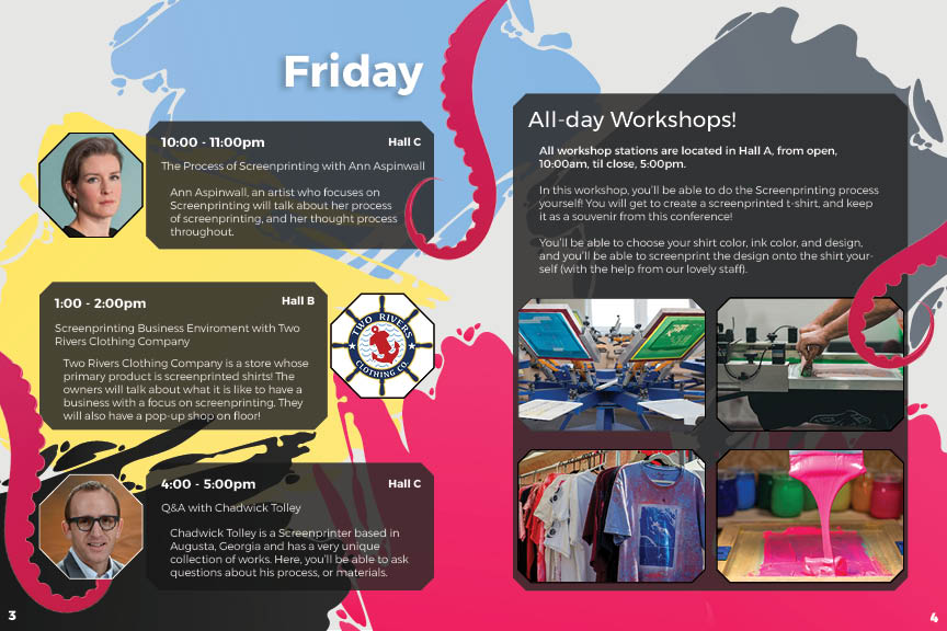 Using a color palette of colors very similar to cyan, magenta, yellow, and black allows for a connection to colors that a printer uses when printing. Also, having a paint splatter motif adds an element of fun, but also shows the messiness of the medium. The octopus tentacles also add an extra element to the work, but also represent how octopus and squid can produce ink when scared. Since the background and the designated motifs are hand-drawn, I used photos to allow you to fully comprehend what you will be doing/seeing during that specific day of the conference.