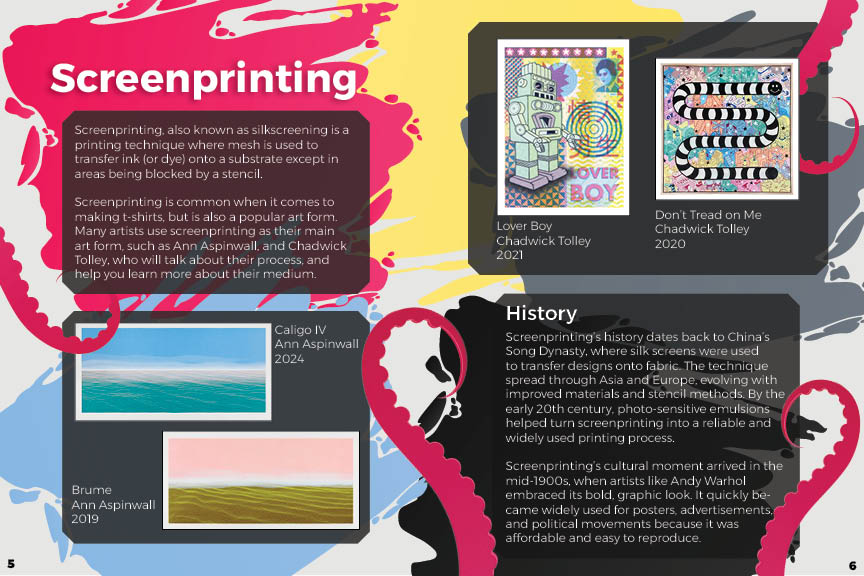 In the booklet, you will have the day laid out on a spread of pages, then the next spread will be information about that specific form of printing, as well as examples from the specific artists who will be talking. This booklet is meant to be informational, about the conference, giving context to the types of printing that will be discussed, as well as the individual events that are going on throughout the day.
